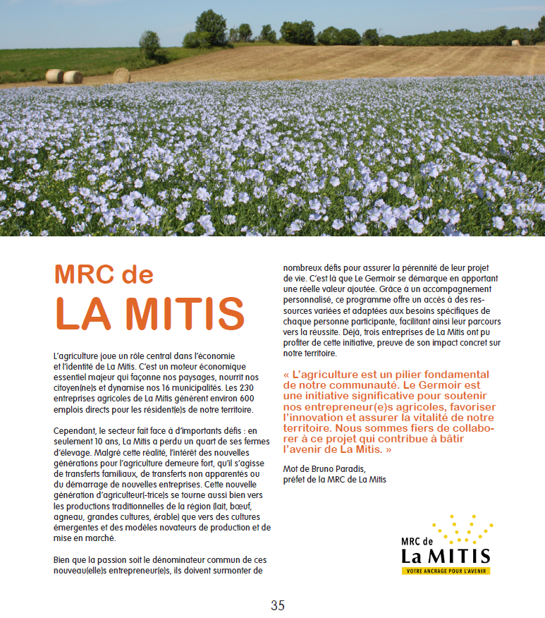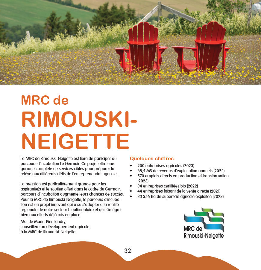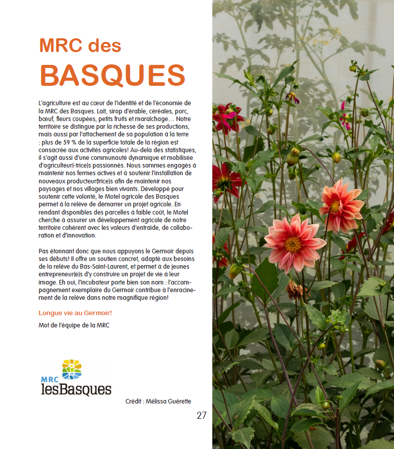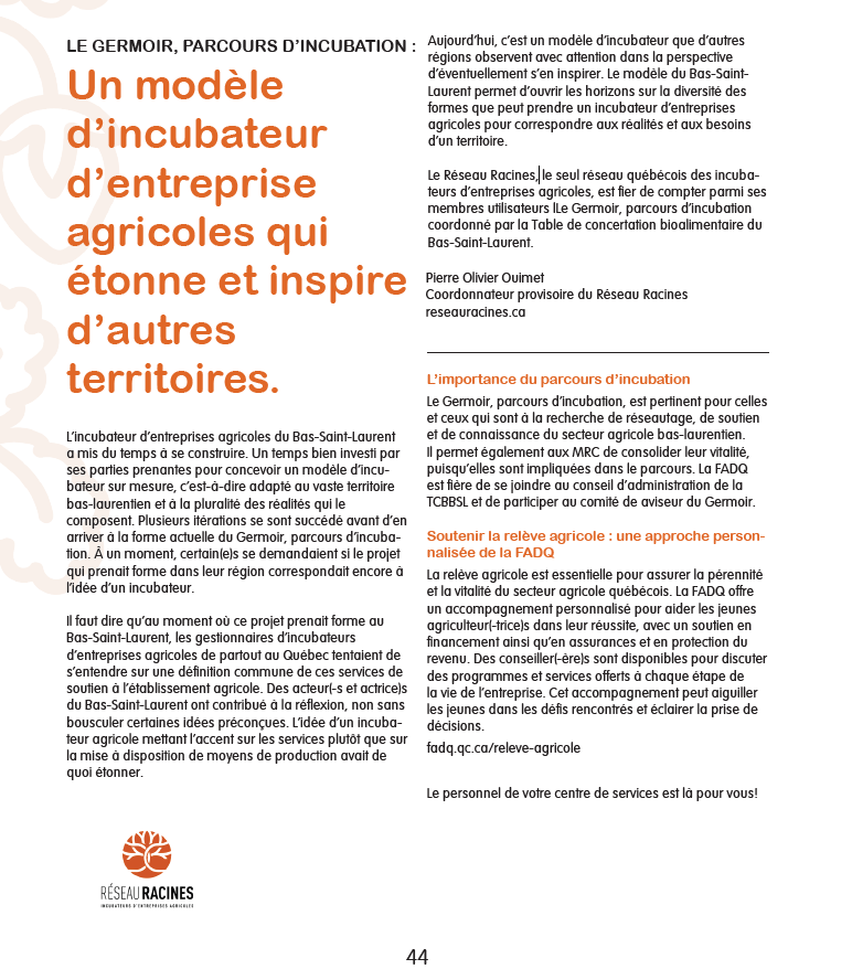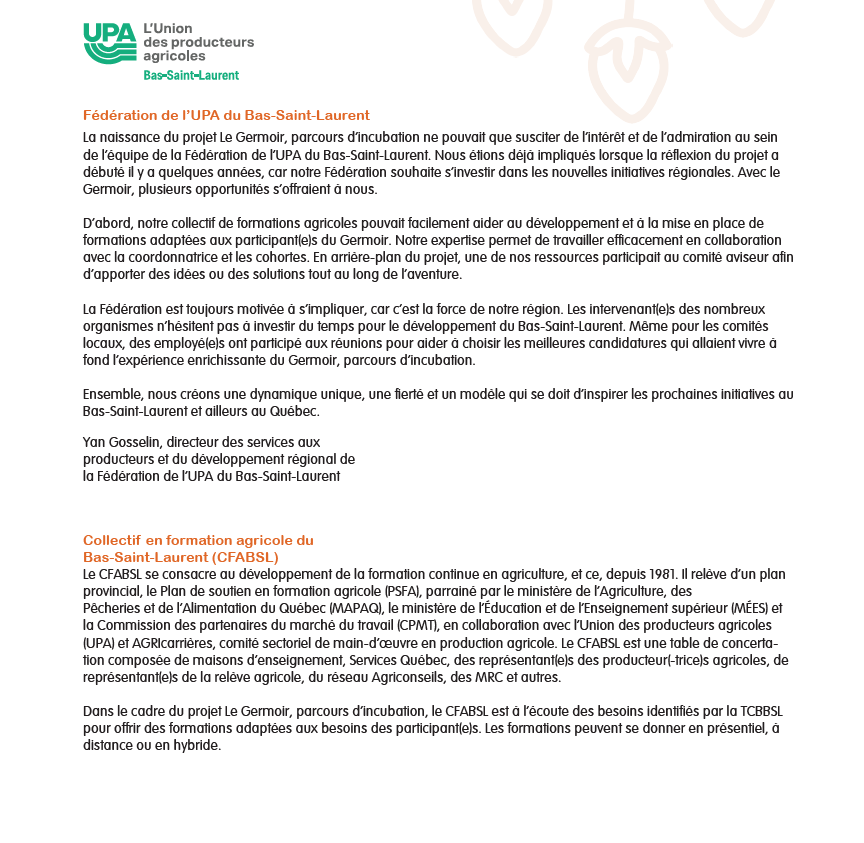 Le Germoir, parcours d’incubation, est une initiative lancée en 2017 pour répondre aux changements observés dans le monde agricole : une relève aux profils plus variés et une baisse du nombre d’entreprises agricoles actives. Pour mieux comprendre les besoins et les solutions possibles, une démarche exploratoire sur les modèles d’incubateurs agricoles a été amorcée. Un comité régional s’est formé et le projet a évolué collectivement pour s’adapter aux réalités du Bas-Saint-Laurent. Aujourd’hui, c’est la Table de concertation bioalimentaire du Bas-Saint-Laurent qui porte le projet. Le Germoir propose un modèle unique au Québec, qui laisse aux MRC une grande liberté dans le choix des projets à soutenir. La sélection des candidat.es est assurée par un comité local.